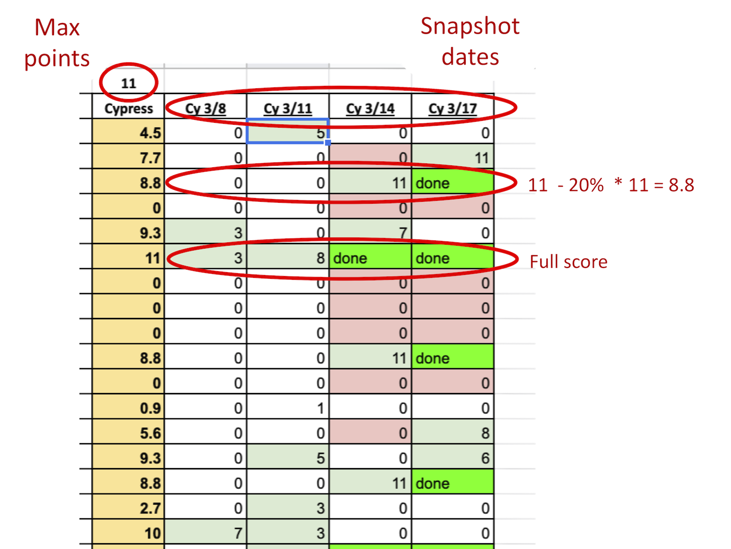 | Team | 75% | Team score × CATME factor | Gitstats, File commit data, CATME, ... |
